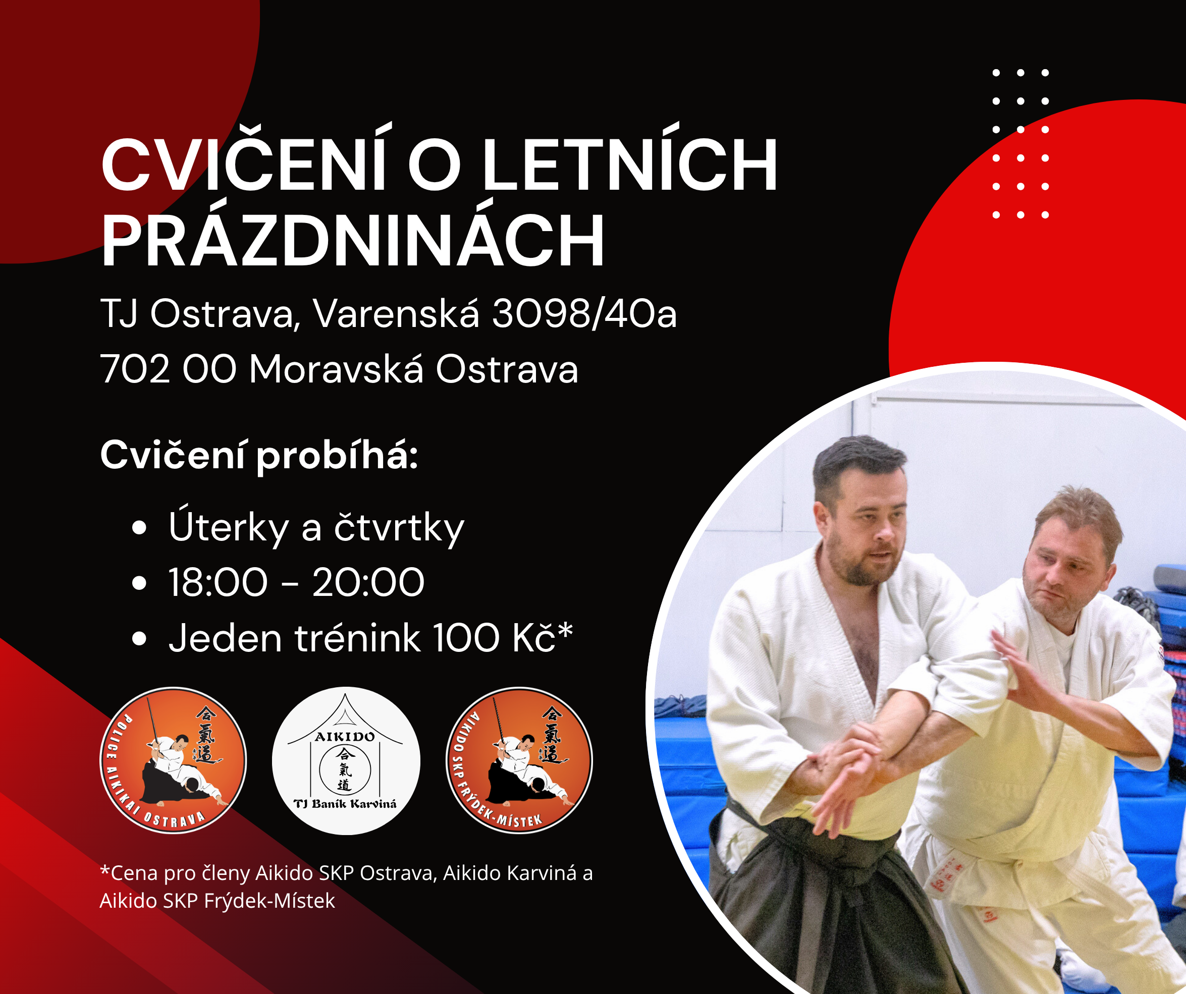 TJ Baník Karviná, z. s. oddíl Aikido Masarykovo nám. 29 733 01 Karviná-Fryštát aikido.karvina@gmail.com Roman Herdzina tel.: +420 728 457 767 Radek Brych tel.: +420 604 147 557