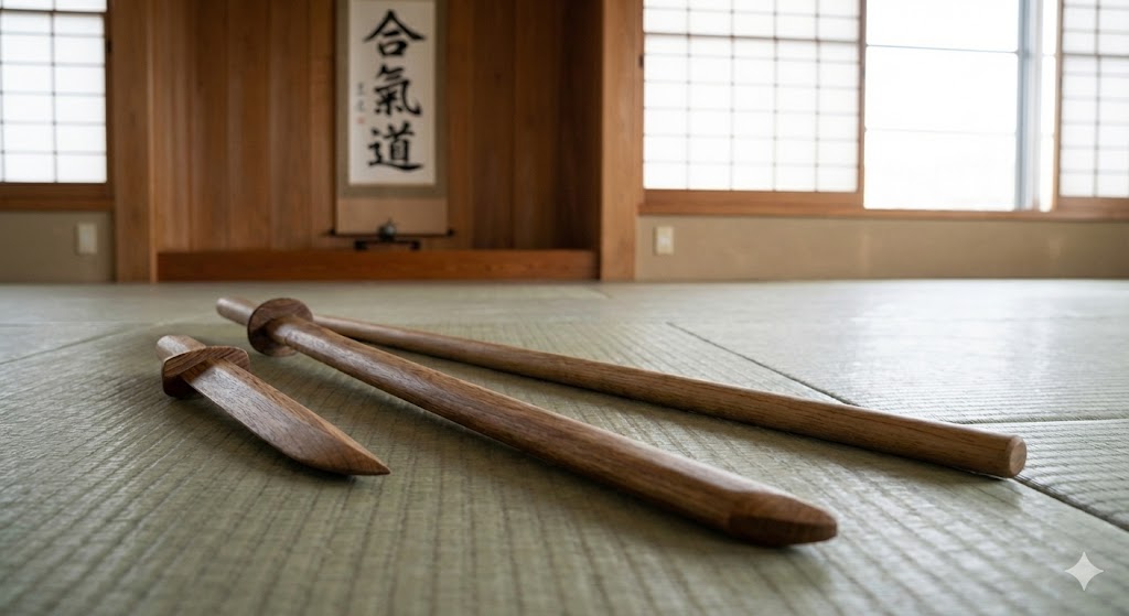 Tyto tři zbraně tvoří celkový repertoár systému Aikido z hlediska principu obrany proti nim i obranou jejich prostřednictvím. Zbraně přenášej v obalu.